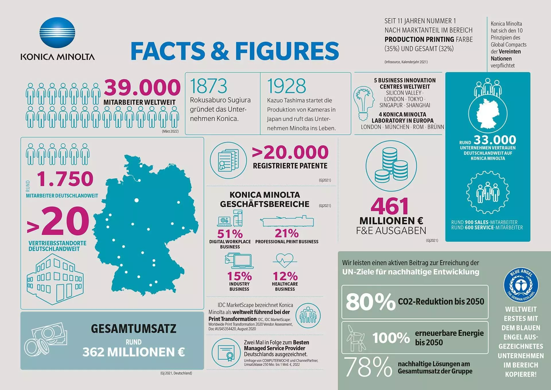 Unser Unternehmen hat sich über viele Generationen und durch turbulente Zeiten hindurch immer wieder gewandelt, weil sich auch die Welt um Konica Minolta herum enorm verändert hat. Gemeinsam wollen wir auch weiterhin für erfolgreichen Wandel stehen und Sie auf Ihrem Weg in eine digitale Zukunft begleiten. Das Aufzeigen und Beschreiten neuer Wege, das Schaffen neuer und nachhaltiger Werte haben wir uns auch im Jahr 2023 auf die Fahnen geschrieben.